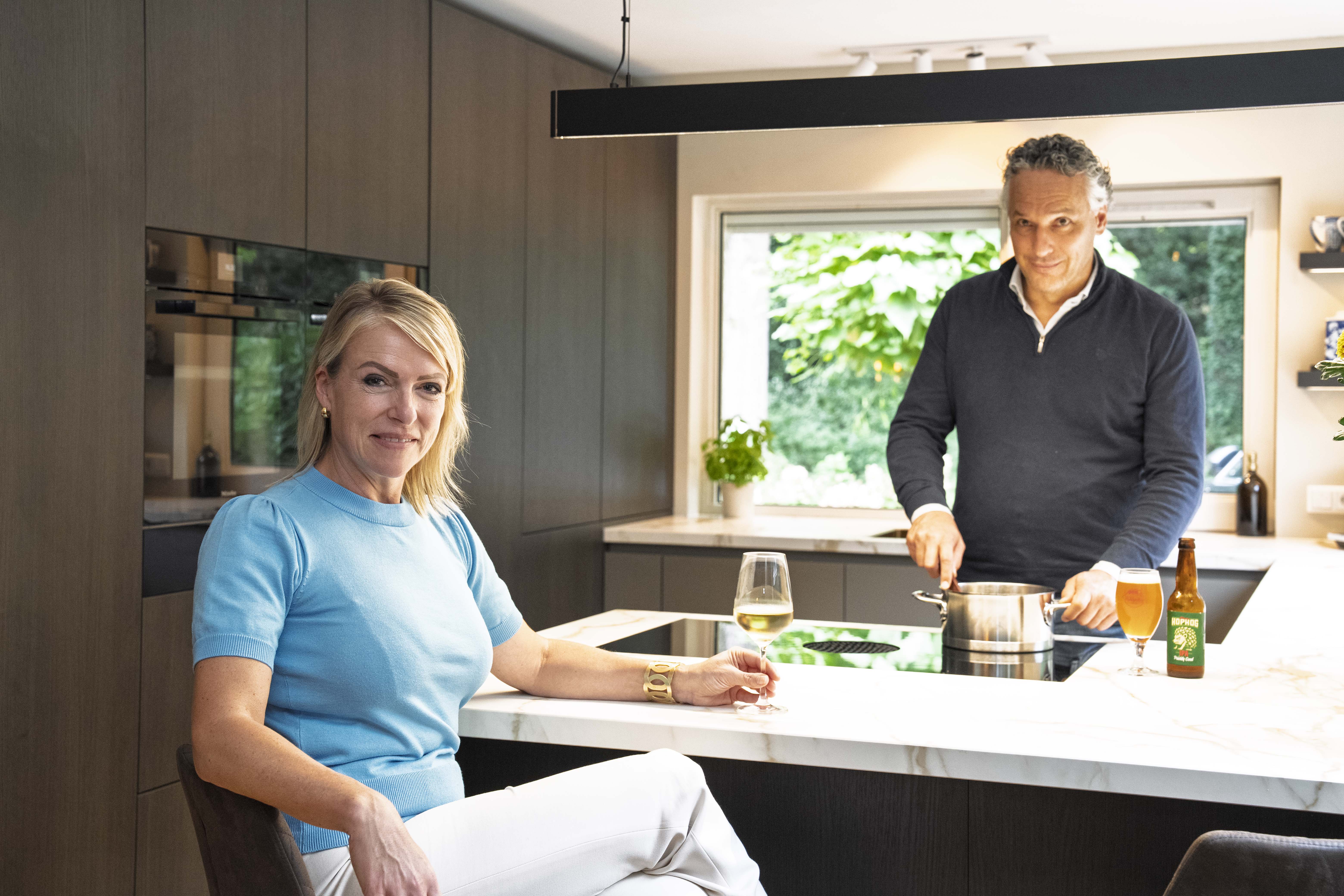 De grap is dat we nu vaker even op de barkruk bij de keuken zitten. Zelfs de kinderen zitten er graag en maken er hun huiswerk. De lange kastenwand is bovendien heel functioneel. Naast de kasten voor de oven en stoombakoven, zijn ook de koeler en vriezer in de wand verwerkt, net als de apothekerskast en de Le Mans-kast met uitzwenkplateaus voor pannen en voorraad.