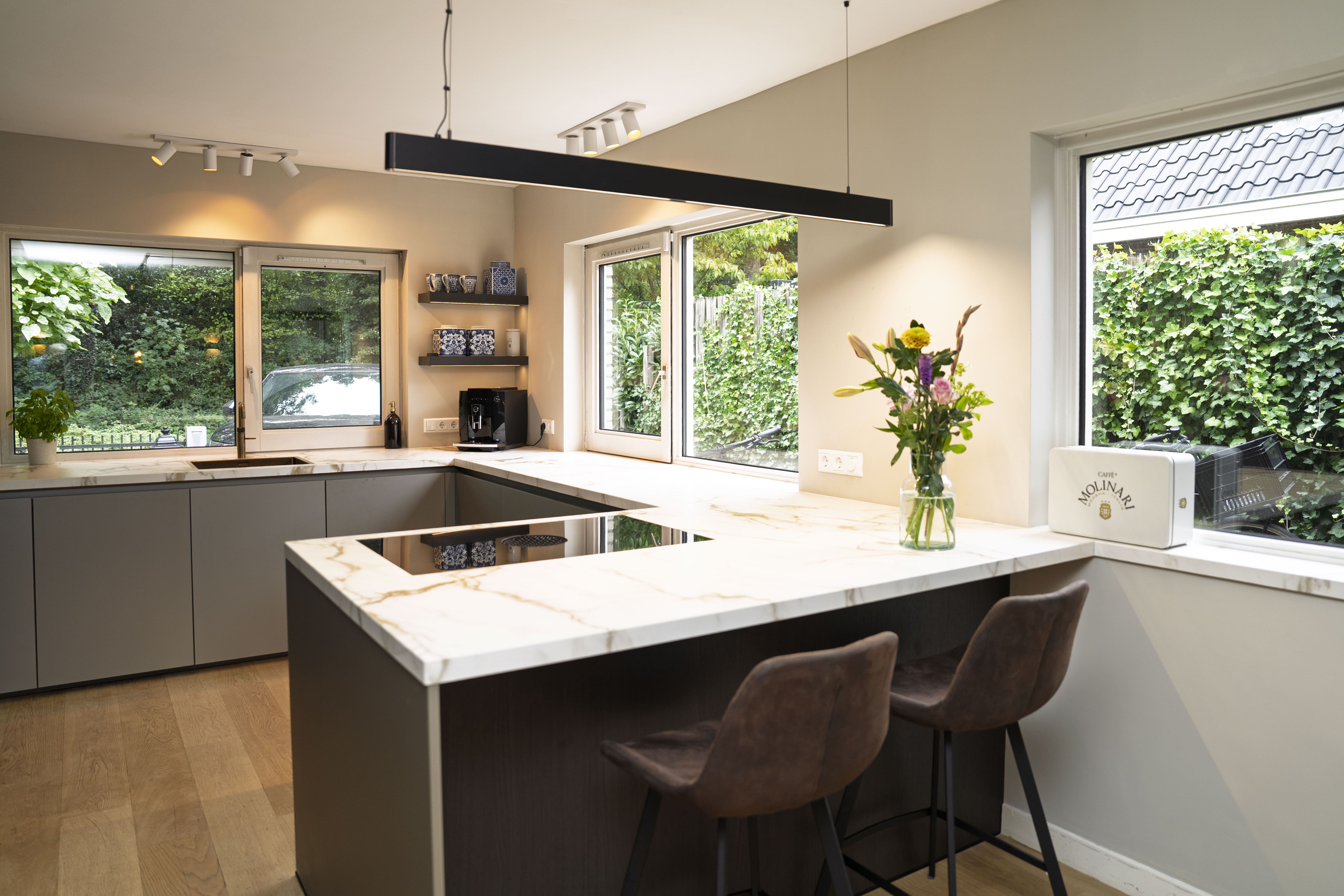Omdat het werkblad verschillende dieptes heeft en doorloopt in de vensterbank, heeft SMAAK keukens het werkblad laten inmeten nadat de keuken was geplaatst. Het is zo prachtig geworden dat zelfs de vensterbank bij de barkrukken naadloos doorloopt in het geheel.