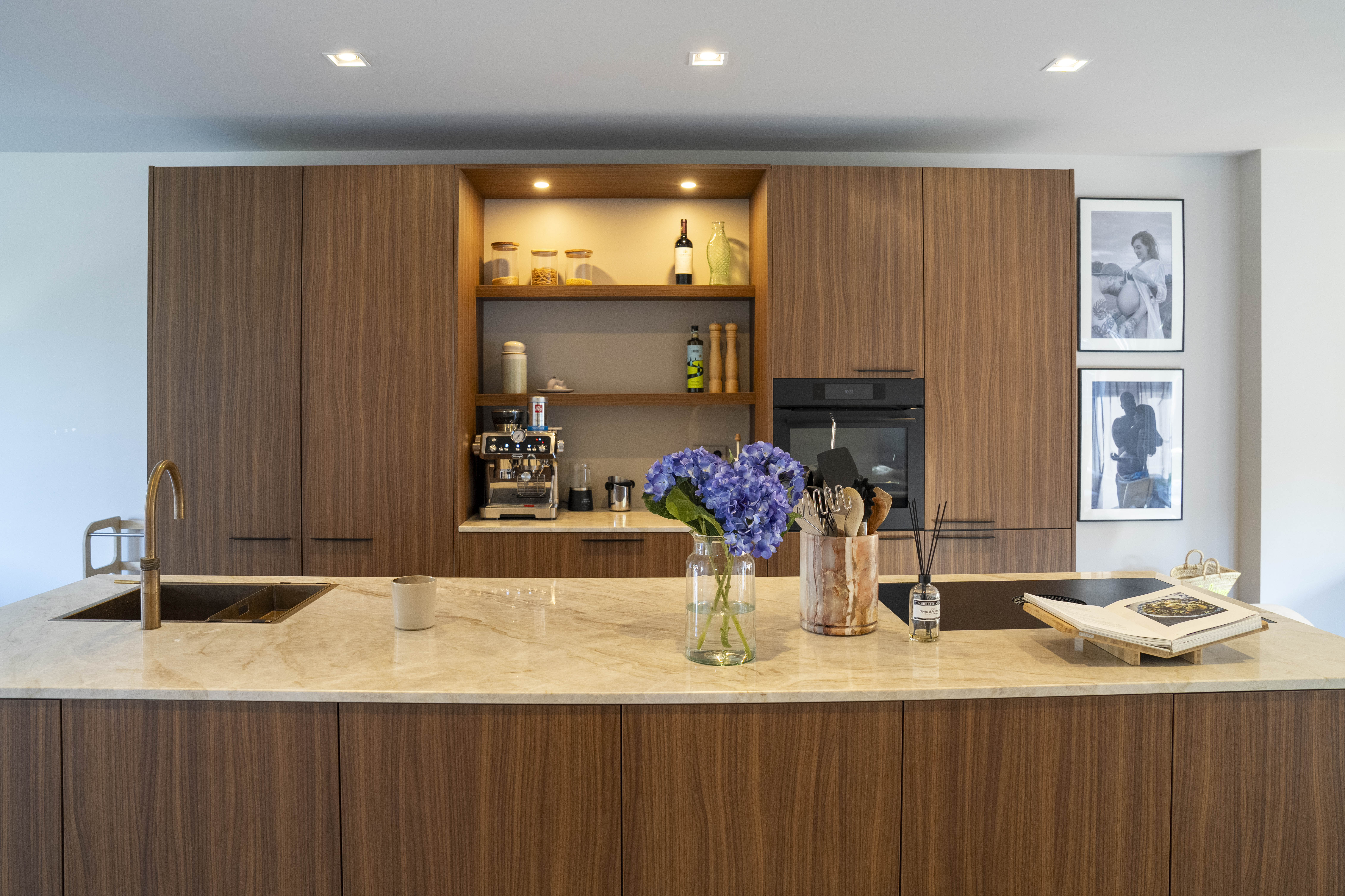 We wisten al snel dat we vielen voor een donker houtkleurige keuken met een Taj Mahal werkblad.
