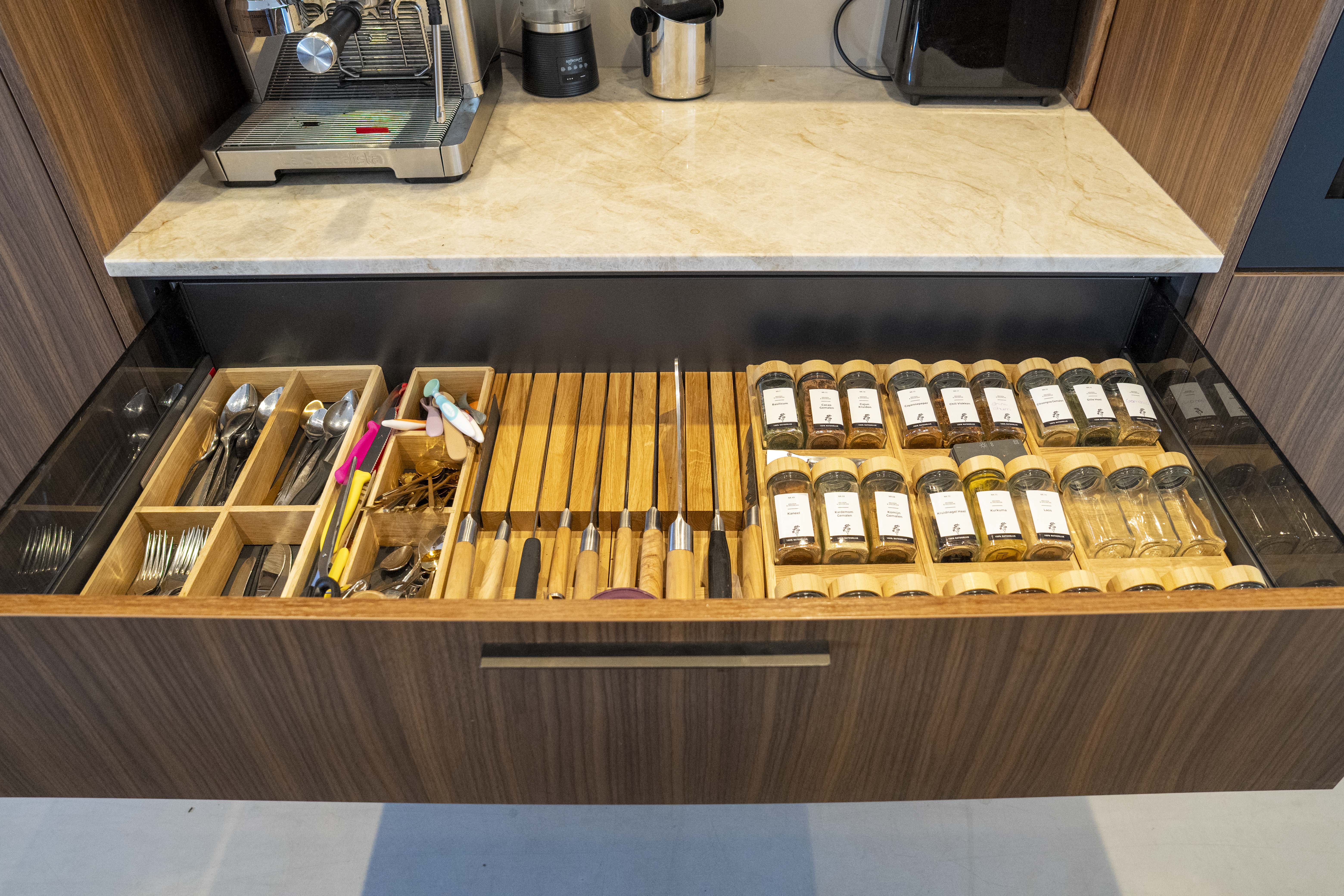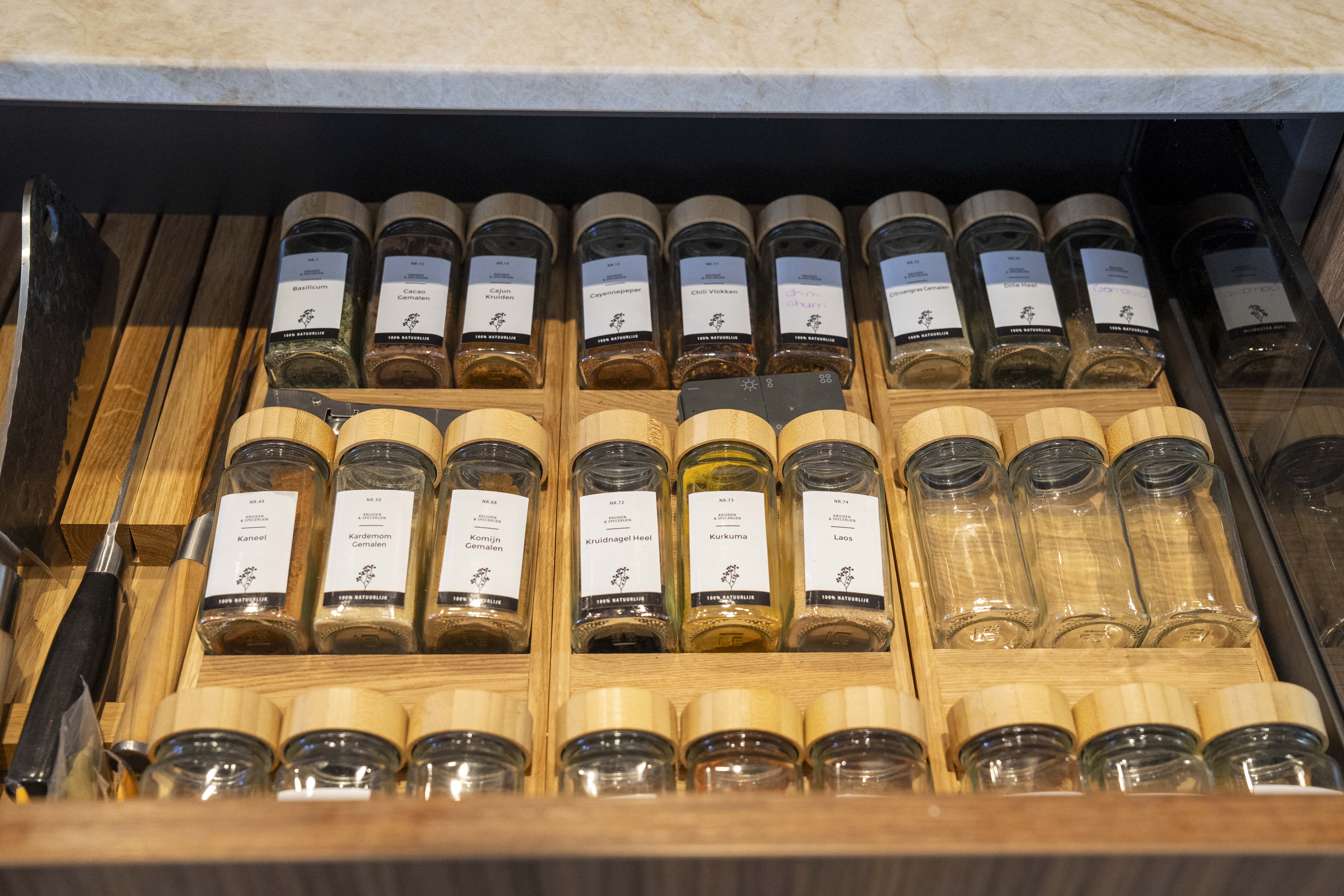 Daarnaast hebben we enorme extra kastruimte aan de voorkant van het kookeiland én houten bestekindelingen met speciale vakjes voor onder andere messen en kruidenpotjes.