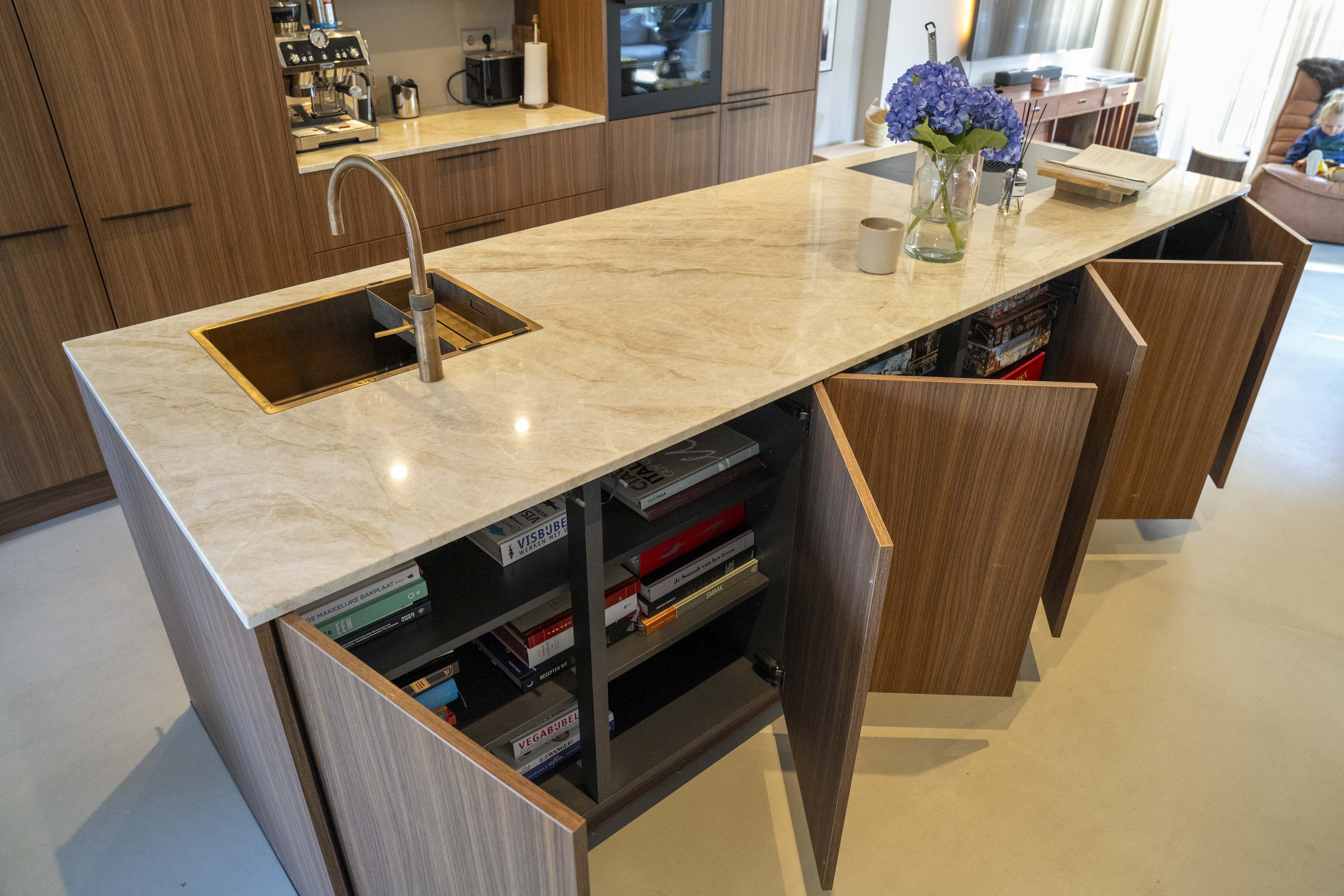Zij is bovendien heel blij met de koffienis precies zoals ze het voor zich zag. Maar het echte zonnestraaltje in huis is het Taj Mahal-werkblad van kwartsiet. “We hebben dit werkblad zelf uitgezocht bij Grillo in Huissen. De plaat waarvan het is gemaakt werd speciaal voor ons bewaard. Het voelt echt als óns werkblad.”