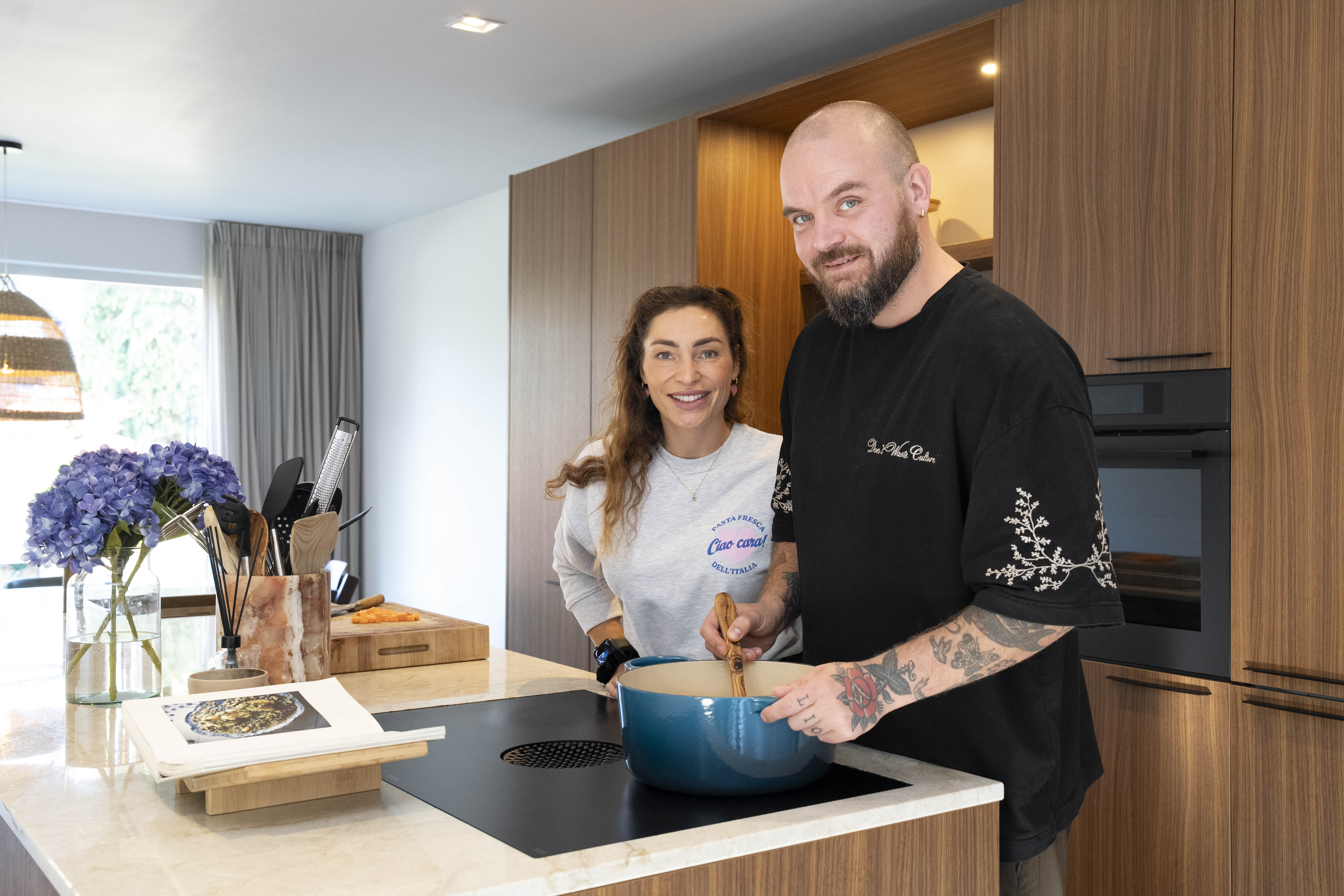 “In onze oriëntatiefase hebben wij een eigen Pinterest-bord gemaakt,” vertelt Nina. “We wisten al snel dat we vielen voor een donker houtkleurige keuken met een Taj Mahal werkblad. Voor Mick was vooral de kookplaat belangrijk, net als voldoende werkruimte om te snijden en gerechten voor te bereiden. Samen met SMAAK keukens hebben we stap voor stap onze droomkeuken vormgegeven.”